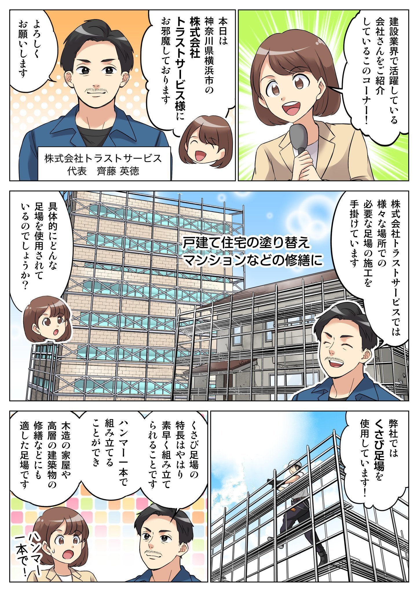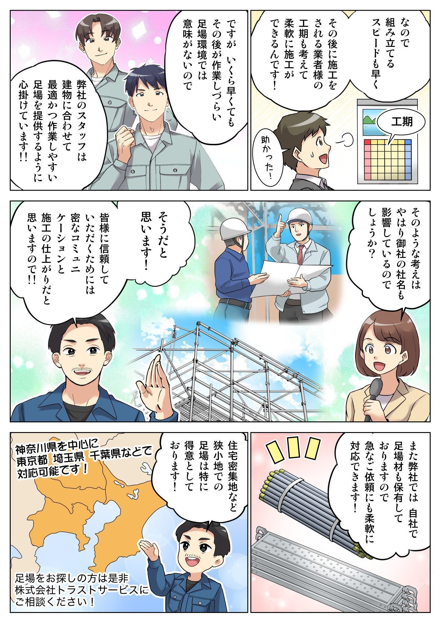トラストサービスの従業員の平均年齢は若く、活気があります。機動力にも優れ、柔軟な対応が可能です。足場においてご希望があれば、お気軽にご相談ください。若くても様々な現場経験を踏んでいる職人ばかりで腕には自信があるので、安心してお任せいただけます。
